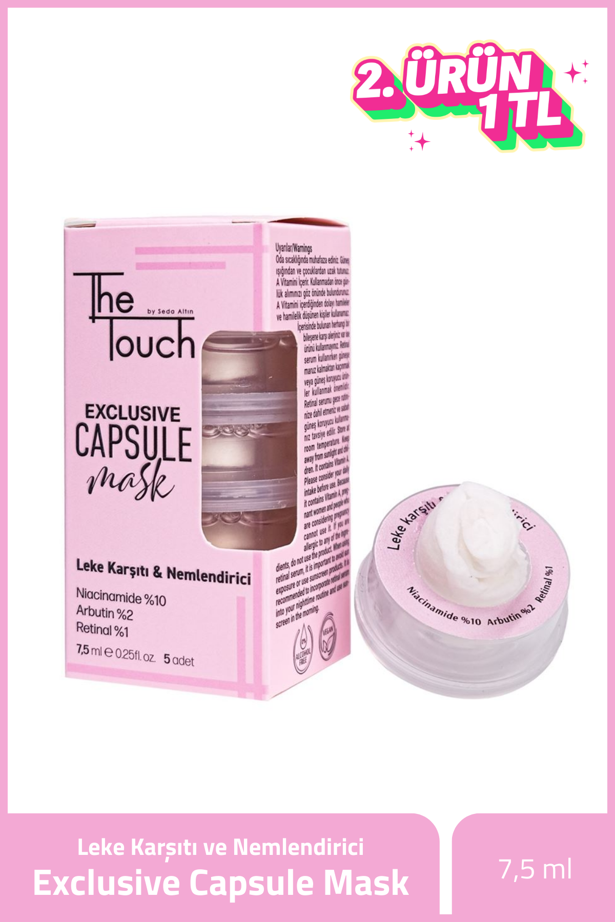 The Touch Leke Karşıtı ve Nemlendirici Exclusive Capsule Mask ana etken maddelerin cildinizde daha iyi tutunabilmesi ve üst düzeyde etki görebilmeniz için maske formunda tasarlanmıştır. İçeriğindeki Pro Vitamin B5 ile cilt bariyerini desteklemeye yardımcı olur. Hyaluronik Asit Kompleksi ile güçlendirilmiş yapısı yoğun nem ve yumuşatıcı etkiye sahiptir. Vitamin B3 (Niacinamide) ve Arbutin ile cildin doğal bariyerini güçlendirir ve korur. Cildin nem kaybını azaltır ve dış etkenlere (kuru hava, rüzgar vb. ) karşı daha dirençli hale getirir. Ciltteki koyu lekelerin ve hiperpigmentasyonun oluşumunun engellenmesinde yardımcı olur. Cilt tonunu eşitleyerek cildin daha parlak bir görünüm kazanmasında etkilidir. Retinal (A Vitamini), retinolden 11 kat daha hızlı çalışır. Bu sayede cildin elastikiyetini arttırarak ince çizgi ve kırışıklık oluşumlarının engellenmesinde mümkün olan en kısa sürede belirgin bir etki sağlar. Ciltteki gözenekleri sıkılaştırır ve cilt dokusunu düzgünleştirir. Cildin pürüzsüz ve genç görünmesini sağlar. Güçlü antioksidan özelliğiyle serbest radikallerin neden olduğu oksidatif stresi azaltır ve cildi çevresel etmenlerden korur. Böğürtlen, Ahududu, Bezelye ve Meyan kökü ekstraktları leke oluşumuna karşı sinerjik etki gösterir.